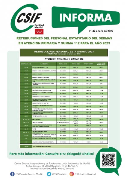 Se pueden ver las tablas completas en cuanto a retribuciones de personal estatutario de Atención Especializada/Hospitalaria, Atención Primaria, SUMMA 112, Personal Laboral y Funcionario del Servicio Madrileño de Salud de la Comunidad de Madrid en el archivo anexo o pinchando AQUÍ