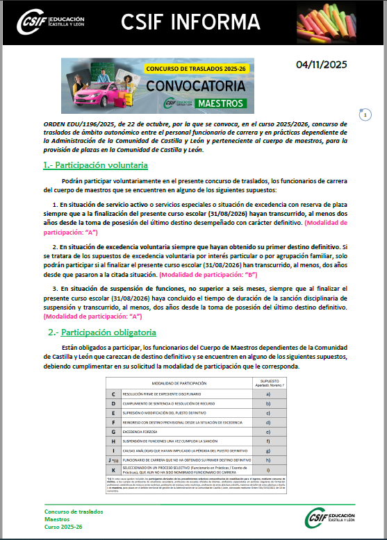 Concurso de traslados de ámbito autonómico. MAESTROS. Convocatoria. Curso 2025-26. Se adjunta CSIF INFORMA.