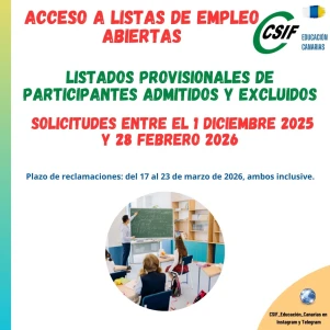 ACCESO A LISTAS DE EMPLEO ABIERTAS 2026. PUBLICADOS LOS LISTADOS PROVISIONALES DE ADMITIDOS Y EXCLUIDOS. SOLICITUDES ENTRE EL 1 DE DICIEMBRE 2025 Y 28 DE FEBRERO DE 2026.